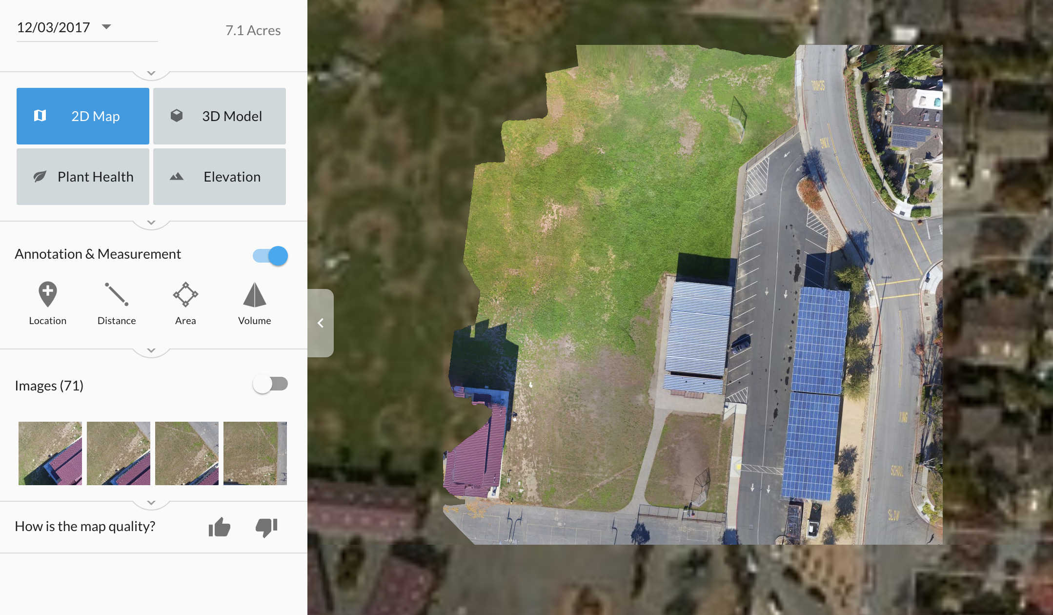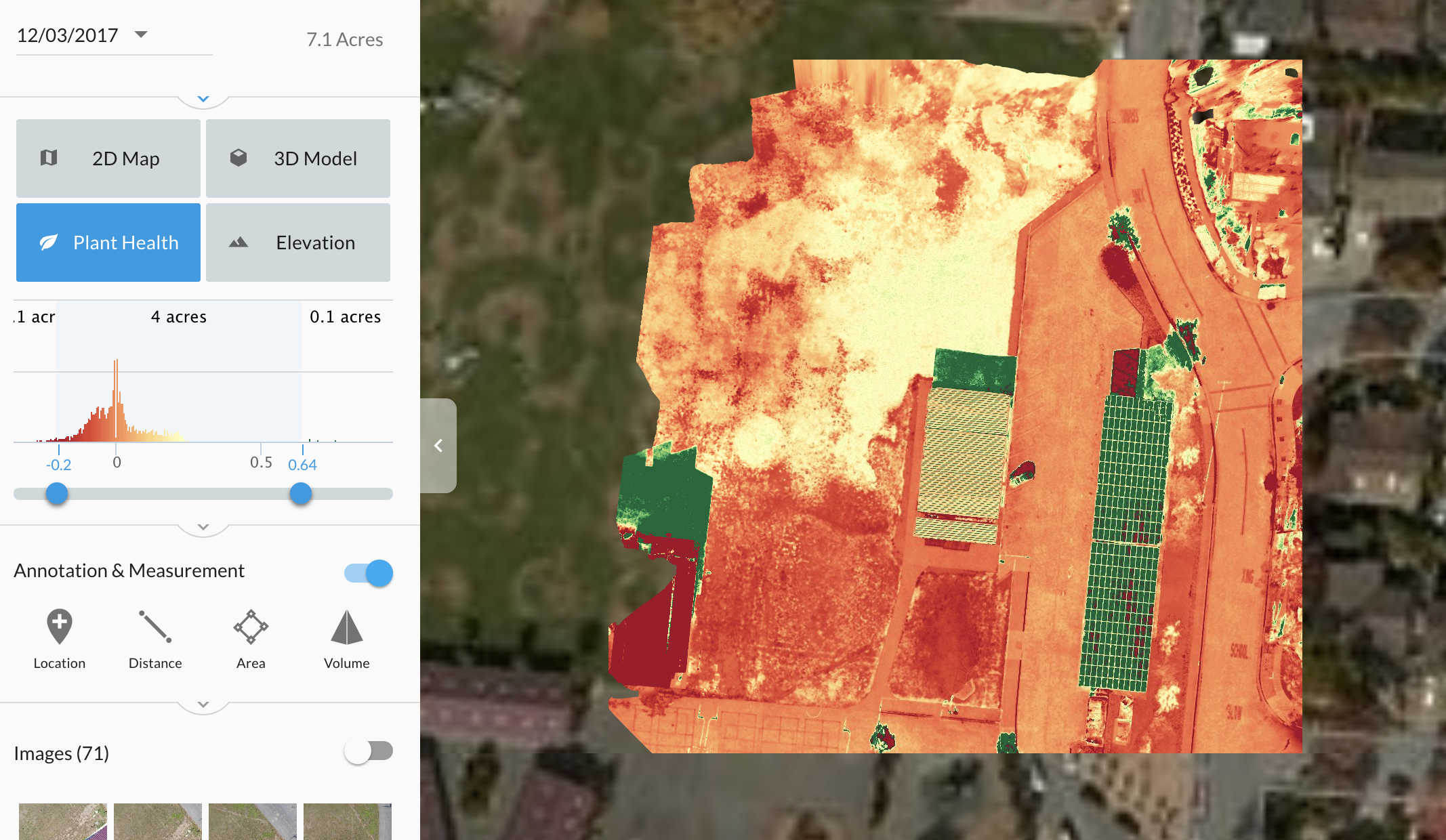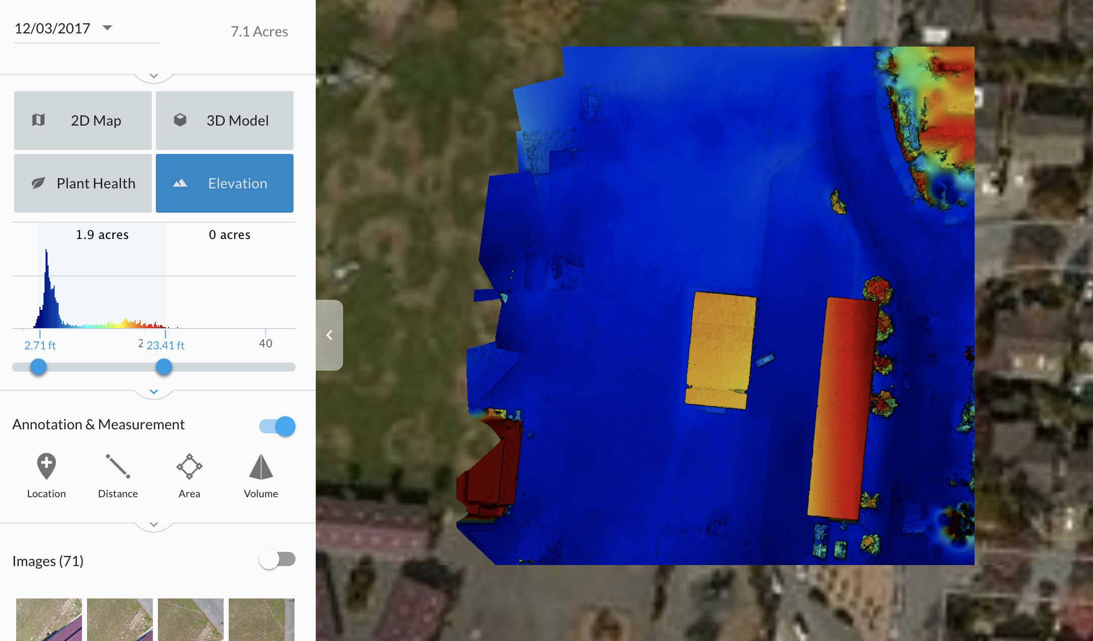 Our pilots are experienced flying the DroneDeploy and Pix4D applications. Ortho and 3D models can be produced covering the desired ground area. The images below were generated from a 71 image capture. The DroneDeploy UI is shown on the left side of the screen. Each map type has different options for distance, area, volume, and other data exports. Individual image files can be reviewed to evaluate the raw data input. Please use the Contact Us form to let us know your project requirements.